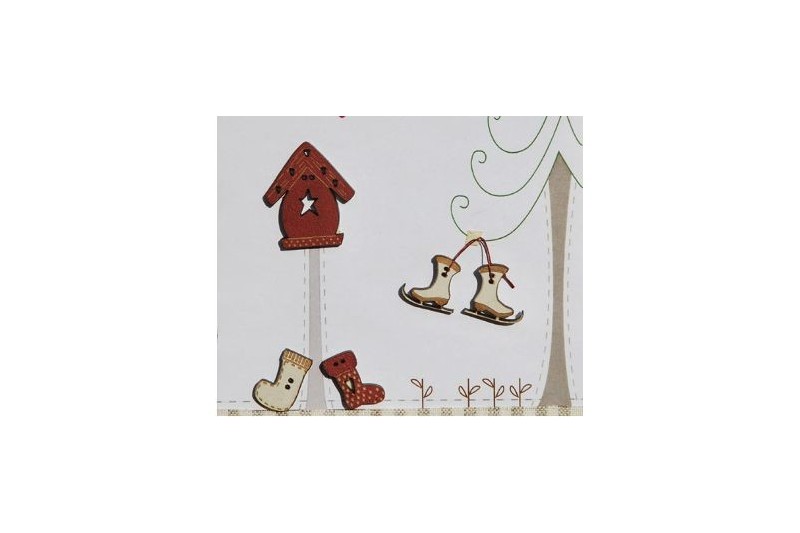 5 boutons en bois peint -rouge et crème - bande de lin rayé.
